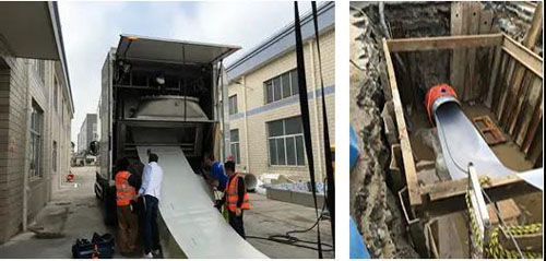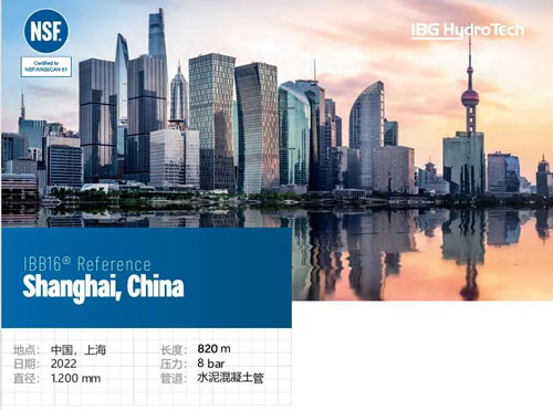 2022年,IBB16®—非开挖无缝压力管道修复的领先系统,在上 海安装。上海是中国超一线城市和国际金融中心,位于中国华东地区。城市高度发达,同时有许多老旧不能挖掘更换的管道。这次成功修复位于上海阜新路一段长820米、直径为1.200毫米 存在4处元宝弯和多道内衬钢环的供水管道的修复。这根管道的工 作压力为8bar。