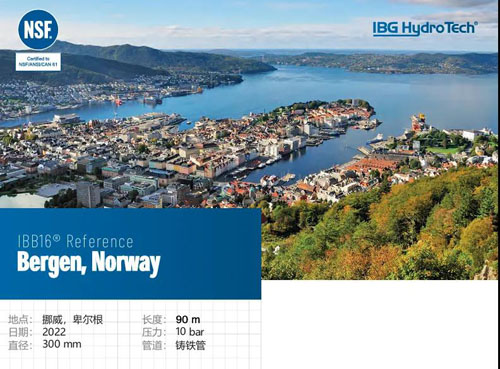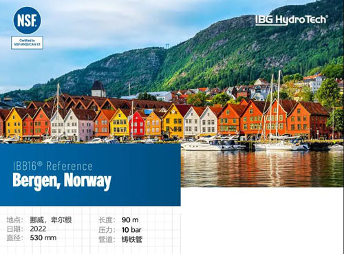 2022年,IBB16®—非开挖无缝压力管道修复的领先系统,在 卑尔根安装。卑尔根是挪威西南海岸的一个城市。周边景观以山脉和峡湾为 主,包括该国最深最长的松恩峡湾。这次修复的主管道非常古老,可以追溯到1860年代,并且处于 危急状态。这个成功的项目包括了一段90米长、DN300mm的铸铁 管道的修复工作。这条管道的工作压力为10bar。