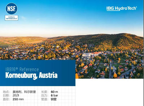 2021年,IBB16®—非开挖无缝压力管道修复的领先系统,在 科尔新堡安装。科尔新堡是下奥地利州韦因菲尔特尔地区的一个市,有13,565 名居民。它是同名地区的地区行政中心和科尔新堡地区法院的所在 地。这次非开完管道修复的项目是对一根长60米、DN250mm的钢 管进行修复。这根管道的工作压力为6bar。
