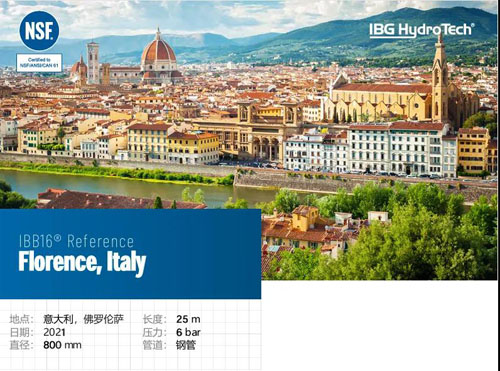 2021年,IBB16®—非开挖无缝压力管道修复的领先系统,在佛 罗伦萨安装。佛罗伦萨是意大利托斯卡纳大区的首府。佛罗伦萨以其众多的文 艺复兴时期艺术和建筑杰作最为人所知。其中最著名的景点之一是大 教堂。这次对一根长25米、DN800mm的钢管成功修复。这根管道的工 作压力为6巴。