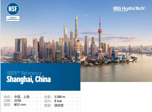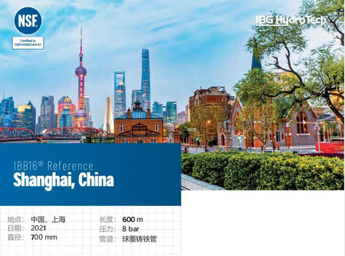 2021年,IBB16®—非开挖无缝压力管道修复的领先系统,在上 海安装。上海,简称“沪”,是中华人民共和国直辖市、国家中心城市 、超大城市,中国的经济、金融、贸易和航运中心。拥有深厚的近 代城市文化底蕴和众多历史古迹。这次项目成功修复一条长600米、直径700毫米的球墨铸铁管。该管道的工作压力为8bar。
