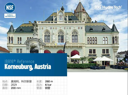 2021年,IBB16®—非开挖无缝压力管道修复的领先系统,在科 尔新堡安装。科尔新堡作为下奥地利州的一部分,科尔新堡县在奥地利的社 会、经济和文化发展中占有一席之地。此外,该县还拥有一些著名 的景点和历史建筑,吸引了众多游客前来参观游览,为当地的旅游 业和经济发展做出了贡献 这次非开完管道修复的项目是对一根长260米、DN200mm的钢 管进行修复。这根管道的工作压力为6bar。