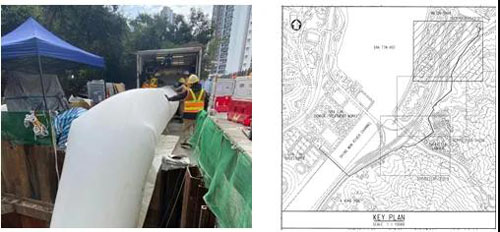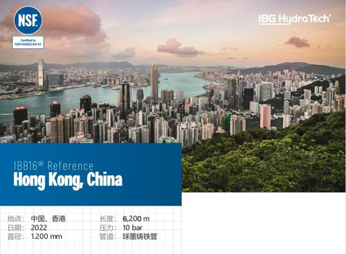 2022年,IBB16®—非开挖无缝压力管道修复的领先系统,在香港 安装。我们这次修复的是香港渠务署运营的从马鞍山污水处理厂到沙田 污水处理厂的双上升主管道。此管道是在80年代用DN1200的球墨铸 铁管制造,工作压力10bar,目的是为了将城镇的日常污水输送到处理 厂。而由于管道位置靠近住宅并且被其他地下设施覆盖,用挖掘的方 式替换整个管道部分变得很困难。并且且它在多处有30度的弯曲,但 是我们的IBB16® 完美解决所有问题,成功地修复了这段管道。