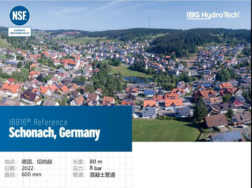 2022年,IBB16®—非开挖无缝压力管道修复的领先系统,在绍 纳赫安装。绍纳赫是位于施瓦茨瓦尔德-巴尔区西北部的黑森林中部的一个 市镇。这个气候疗养胜地也以冬季运动中心而闻名。此次项目是对一条80米长、DN600mm的混凝土管道进行修复 。这条管道的工作压力为8bar。这条管道是一条老旧的混凝土管道 ,在之前运行中发生了爆裂事故
