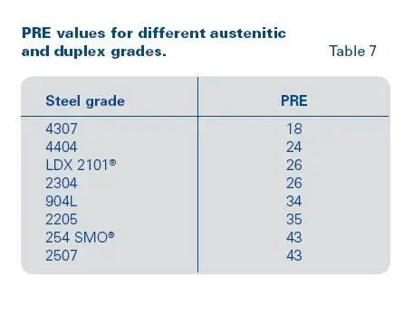 3、双相钢耐氯离子腐蚀怎么样?有同学会问,双相钢耐氯离子腐蚀怎样?性能如何?下图为PRE耐腐蚀当量值,耐点腐蚀指数 PRE (PittingResistance Equivalent) 数值反映的是材料的耐氯离子点腐蚀倾向。从下图可以看出,双相钢2101、2304、2205、2507四个牌号耐腐蚀倾向均大于普通316L,有些材料和超级不锈钢相当。如2507耐点腐蚀就媲美254SMO,2205与904L的耐氯离子点腐蚀腐蚀性能相当。代入上面第2部分,很清楚可以看到他们排在什么位置。