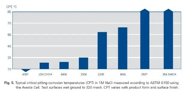上面G150腐蚀试验是奥托昆普发明的电化学临界点蚀温度的标准试验方法,临界点腐蚀温度如上:可以看出,G150结果与PRE数值结果类同。