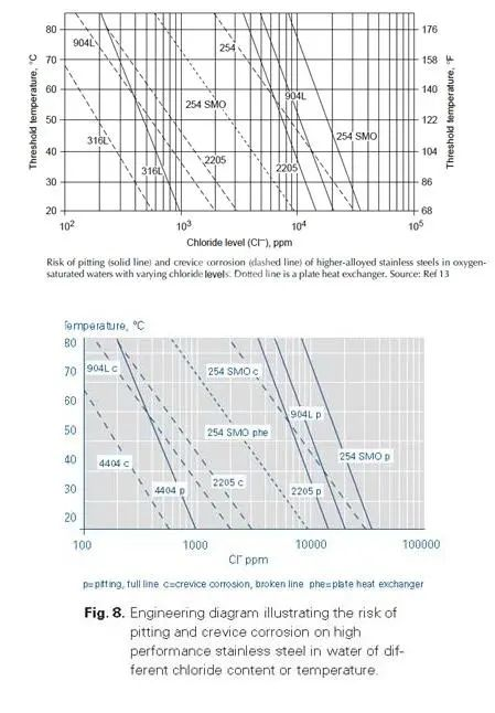 上面黑白图和蓝色图一样,是来自奥托昆普不同年份和版本的图示,可以看出:316L耐氯离子点腐蚀性能远低于254SMO,耐缝隙腐蚀结果同样。如60度温度时候,316L仅耐200ppm不到,904L耐8500ppm,254SMO耐15000ppm氯离子。数值大家可以按图索骥