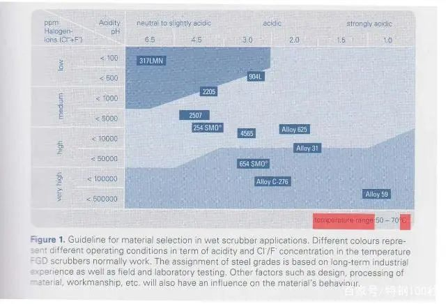 以上两图年代不同,结果类似,上图是奥托昆普结果,下图为德国VDM公司。图示收集了从0~20万ppm氯离子+氟离子腐蚀工况(大部分是氯离子)的选材区间,是不可多得的氯离子选材参考。下图更直观,50~70度温度下,按照酸碱性和氯离子浓度直接找到对应材料即可