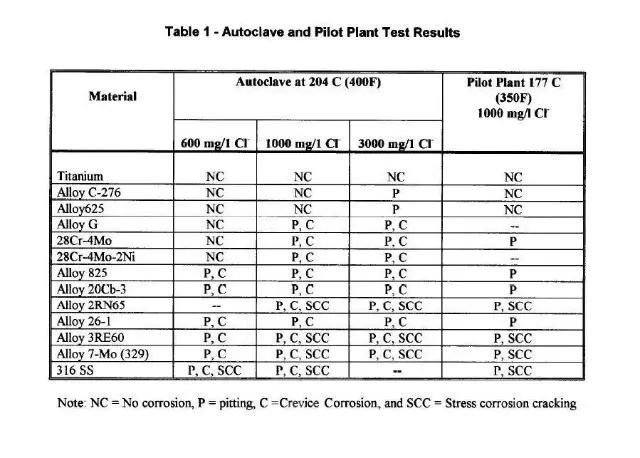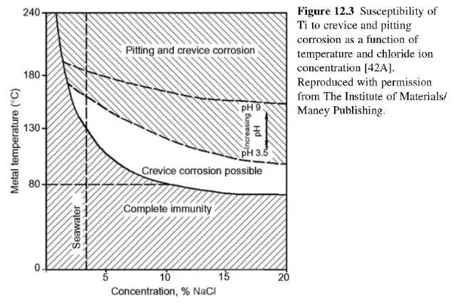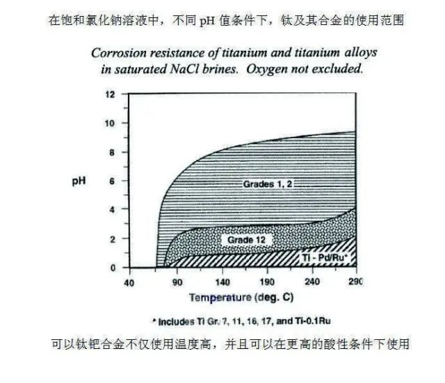 上一张图标,第一行是钛材,可以看出,当C276镍基合金在204度的温度、3000ppm高压釜下开始有点腐蚀时候,钛材还依然在战斗,没有任何腐蚀。钛材在氯离子腐蚀上的应用。众所周知,钛材对高氯离子的海水环境几乎是免疫的,基本没有腐蚀。海水的盐度通常小于5%,根据长期的实验和实际使用,认为纯钛可以在120度以下的海水中安全使用,但温度再升高就有可能发生缝隙腐蚀,继续升高就有可能发生点蚀。钛在不同浓度,PH值(3-9),温度的NaCl溶液中的使用范围见下图所述!