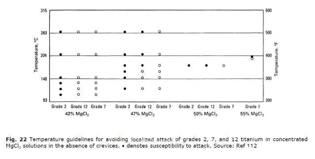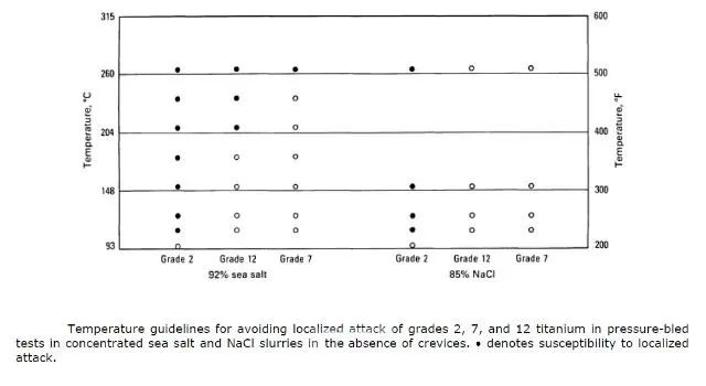 可以看出,在该工况中,钛钯合金和钛镍钼合金耐氯离子的程度比纯钛高的多!耐腐蚀度:Grade7>Grade12>纯钛(Grade2)注意:图中白色圆圈代表可以使用;黑色圆圈代表容易发生缝隙腐蚀或点蚀;白色三角形代表发生轻微的缝隙腐蚀,但是不影响使用。对于重量百分比、体积百分比与ppm之间的换算,请另存下图。