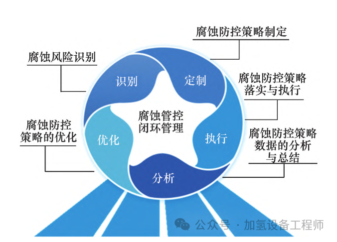 腐蚀问题是影响装置长周期运行的重要因素,为切实减少腐蚀引发的泄漏事故,炼化企业需基于设备完整性管理持续探索构建基于腐蚀回路的防腐管理体系:“腐蚀风险识别→腐蚀防控策略制定→腐蚀防控策略落实与执行→腐蚀防控策略的数据分析与总结→腐蚀防控策略优化”。