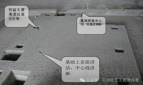 2)基础上标高基准线、纵横中心线及预留孔中心线明显;
