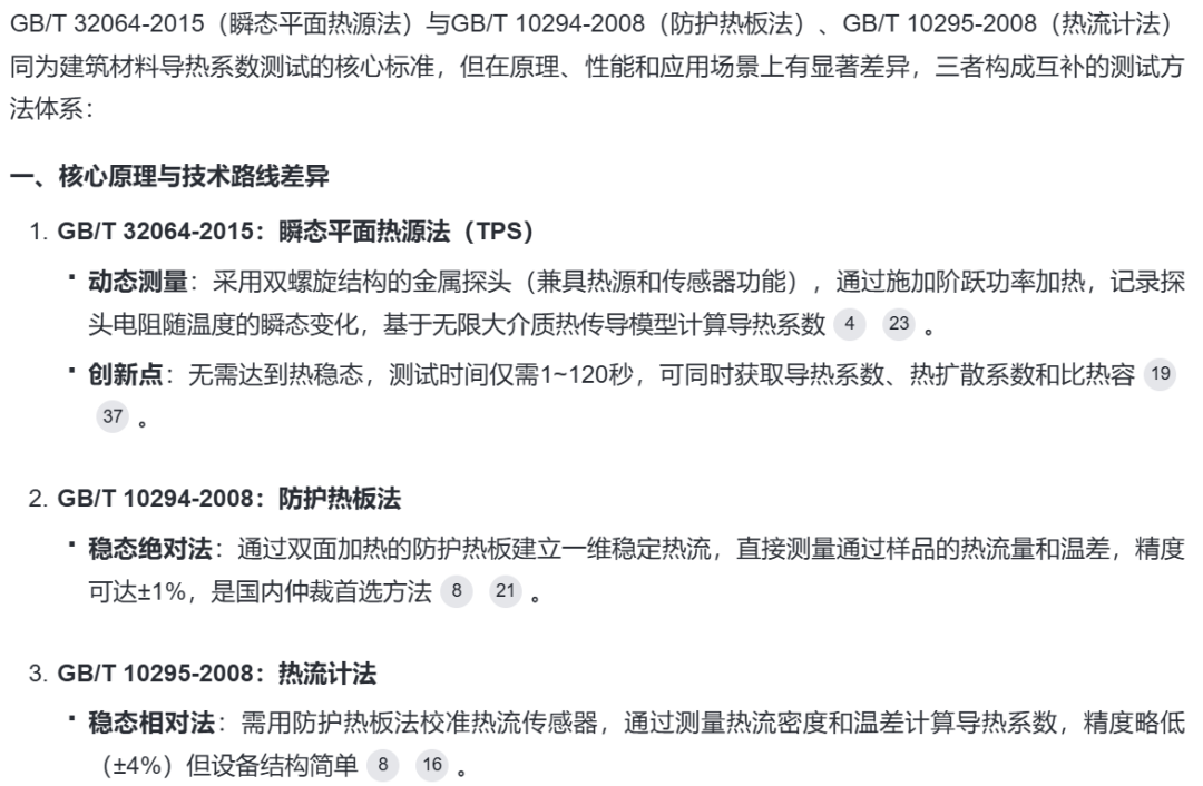 GB/T 10295-2008 绝热材料稳态热阻及有关特性的测定——热流计法GB∕T 32064-2015 建筑用材料导热系数和热扩散系数——瞬态平面热源测试法前两个方法GB/T 10294和GB/T 10295都是稳态法测量,后者GB/T 32064是瞬态法,其差别如下: