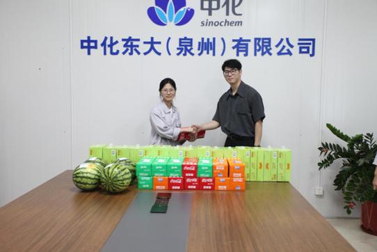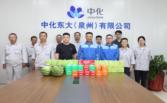 炎炎盛夏,持续的高温天气给基层一线员工带来了身体和心理的双重“烤”验。为切实做好防暑降温工作,近日,第三事业部严春佳总经理、刘炳琪经理、慰问中化东大(泉州)24万吨/年聚醚多元醇项目坚守工作岗位的员工,在三伏天为他们带去一缕清凉,传递来自公司的深切关怀。