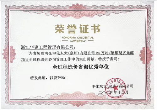 振奋好消息!浙江华建工程管理有限公司凭借在中化东大泉州聚醚多元醇项目中的卓越表现,荣获“全过程造价咨询优秀单位”称号。这一荣誉不仅是对我们专业能力的高度认可,更是对团队辛勤付出的最好见证。在这个项目里,我们始终秉持“提供价值服务,赢得服务价值”的企业文化,与各方紧密协作,攻克重重难关。