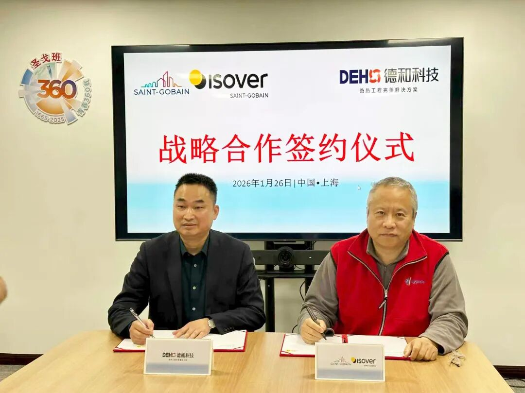 2026年1月26日,德和科技集团股份有限公司(以下简称 “德和科技”)与全球轻型与可持续建筑领导者法国圣戈班集团(以下简称 “圣戈班”)正式签署战略合作协议,标志着双方将整合全球资源与本土优势,在绝热节能材料创新、绿色建筑解决方案落地等领域展开深度协同,共同赋能 “双碳” 目标实现。