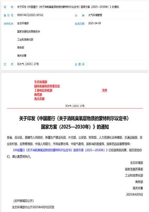 近日,生态环境部举行例行新闻发布会上,生态环境部新闻发言人裴晓菲介绍,生态环境部等近日印发《中国履行〈关于消耗臭氧层物质的蒙特利尔议定书〉国家方案(2025—2030年)》(下称《国家方案》)提出,全面加强消耗臭氧层物质和氢氟碳化物管理,协同应对臭氧层损耗和气候变化,推动相关行业绿色低碳高质量发展。